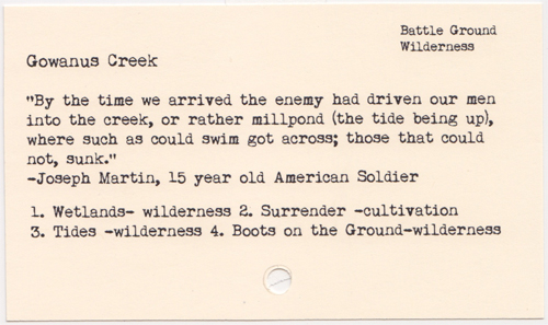 The Wetlands file cabinet drawer for the Conditions on the Ground piece refers to the fierce fighting around the Gowanus Creek. The area was a marshland at the time and the fighting took place at high tide. A 15 year old soldier describes the conditions: