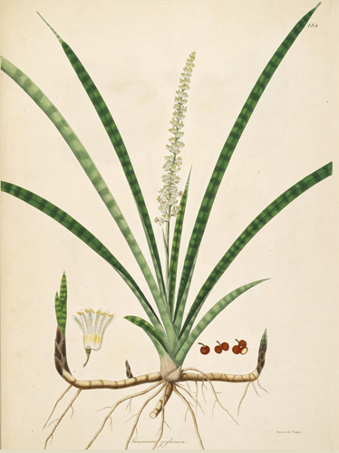 On page 184 is a beautiful drawing of the Sansevieria Roxburghiana — a Sansevieria native to India, that incidentally makes an appearance as an ingredient in a recipe for male virility in the Kama Sutra.