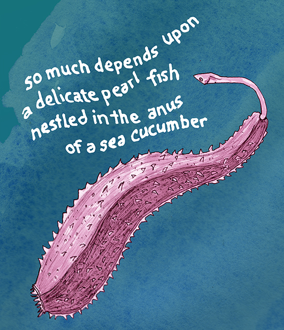 The other day I was reading a book about a book about the coral reef. I was struck by a sentence suggesting that the health of the coral reef depends in a small part on the fact that the glass eel (pearl fish) gets protection nestled inside the anus of a cucumber. How wonderful! I did a little more looking into it. And indeed, the sea cucumber is the earthworm of the reef. Around the same time I was “digesting” this fact, Stephanie, my partner was getting a tattoo of oranges on her arm. She grew up surrounded by orange groves (no longer there) in southern California. I toyed with the idea of getting a tattoo of a glass eel and a sea cucumber on my upper arm. I probably won’t. But I drew this picture, as a possibility. It’s good to remember the little, magical details in life.