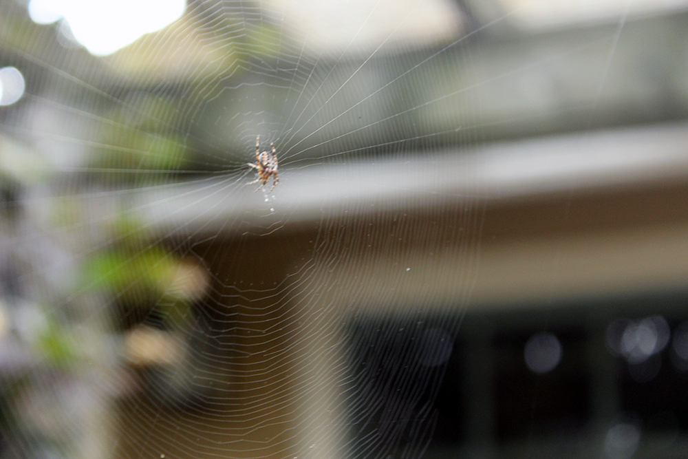 The backyard here in Portland is threaded with spiders webs. They launch their traps from the side of the house to the recycling bins, they rappel from the windows to the deck, the hang in wait from the trellis and lawn chairs. They dangle from the grill and swing from shingles to drape their sticky traps. In order to toss the garbage or get a bike from the shed we are forced to circumvent their silken dragnet.