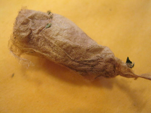 This morning I put on a pot of water to boil. I carefully peeled the first cocoon from the dried leaf surrounding it. When the water started a rolling boil I turned down the heat just a little bit. Then I dropped the cocoon in. In order to get the silk from the cocoon you must kill the larva inside. If the moth hatches then the silken strand will be break into unusable short bits. This is the dark underside of the silk process (though there are some silkmoths that have been bred to emerge from there cocoons without disturbing the silken thread, these wild Samia cynthia are not those). Before I dropped the cocoon into the water I gave it a gentle shake. I could hear something rattling inside, like a small bean. As it cooked, steam lifted from the pot and floated over the stove. I did not like boiling the cocoon.